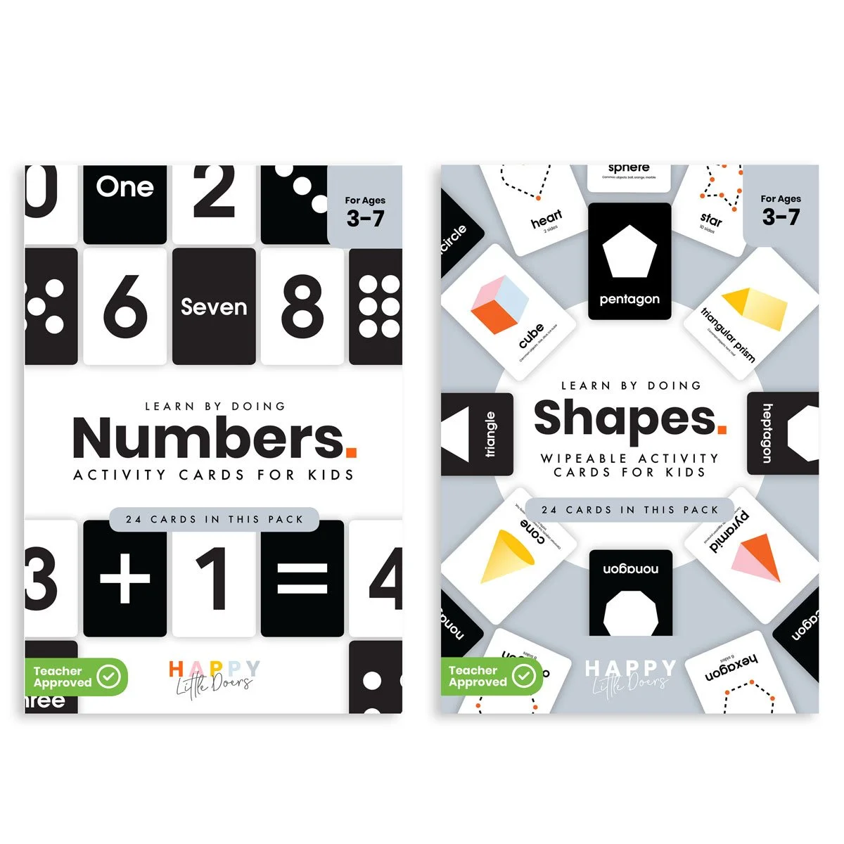 ‘The Preschool Starter Bundle’ has the essential packs for starting off simple number learning and shape recognition & formation from preschool age. The cards have a simple design in black and white, deliberately to minimise distraction in learning. The activity cards supplied are perfect for understanding number relationships, developing memory recall, building fine motor skills and of course, increasing confidence and happiness through interactive learning through doing.